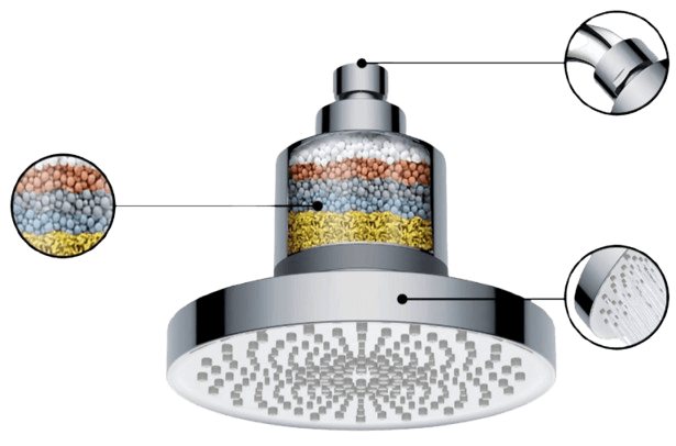 Activated carbon, KDF, and ceramic beads are some of the filters that the water goes through as it runs through the showerhead. These filters work together to catch and get rid of toxins.
